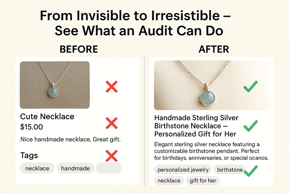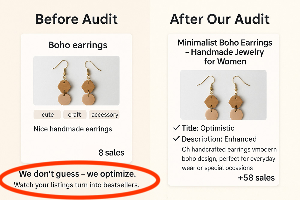 Our Etsy Store Audit Service is not a simple checklist – it’s a deep, personalized dive into your shop. We analyze your shop’s data, the Etsy algorithm, and buyer psychology (related to your niche) to uncover your unique strengths and hidden growth opportunities.